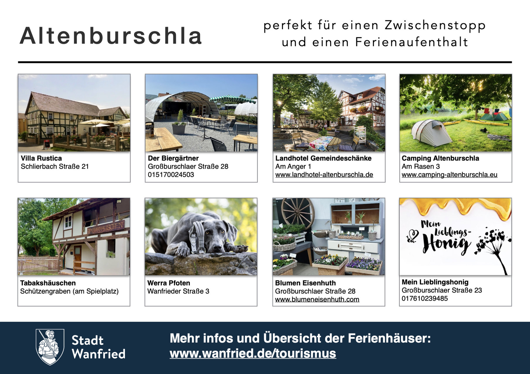 Altenburschla ist heute ein ruhiger und gastfreundlicher Ort. Die ruhigen Straßen, Wanderwege und schönen Aussichten auf den Fluss sind für Touristen echt attraktiv. Die Dorfbewohner kennen sich immer noch beim Namen und organisieren kleine Feste und Veranstaltungen, an denen alle teilnehmen. Ich hänge die Ankündigungen für die Dorffeste an den Waschbecken auf.